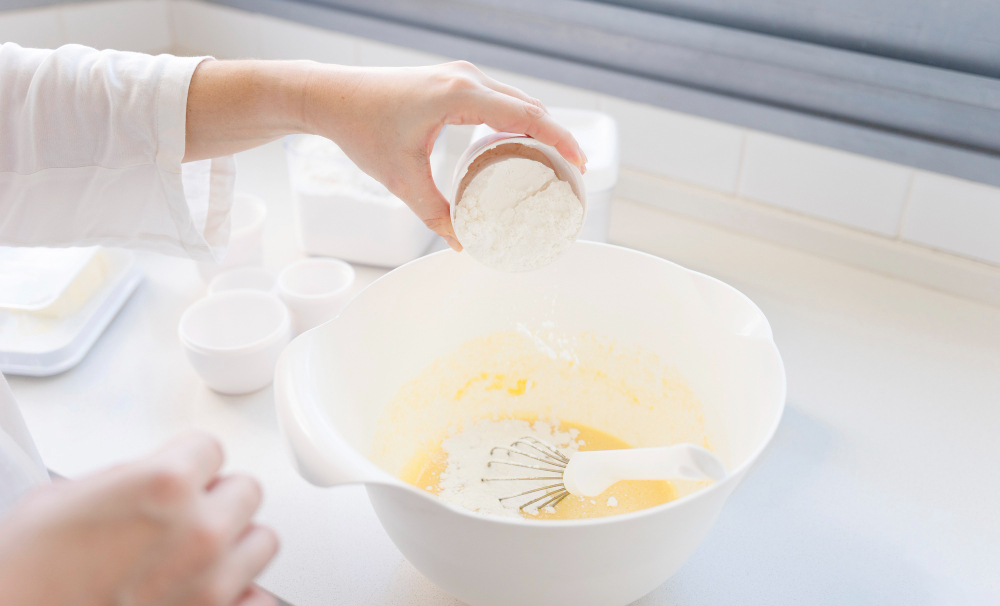 3 žingsnis. Kruopas berkite plona srovele, nuolat maišydami šluotele arba šaukštu. Tai svarbiausias žingsnis norint išvengti gumuliukų.